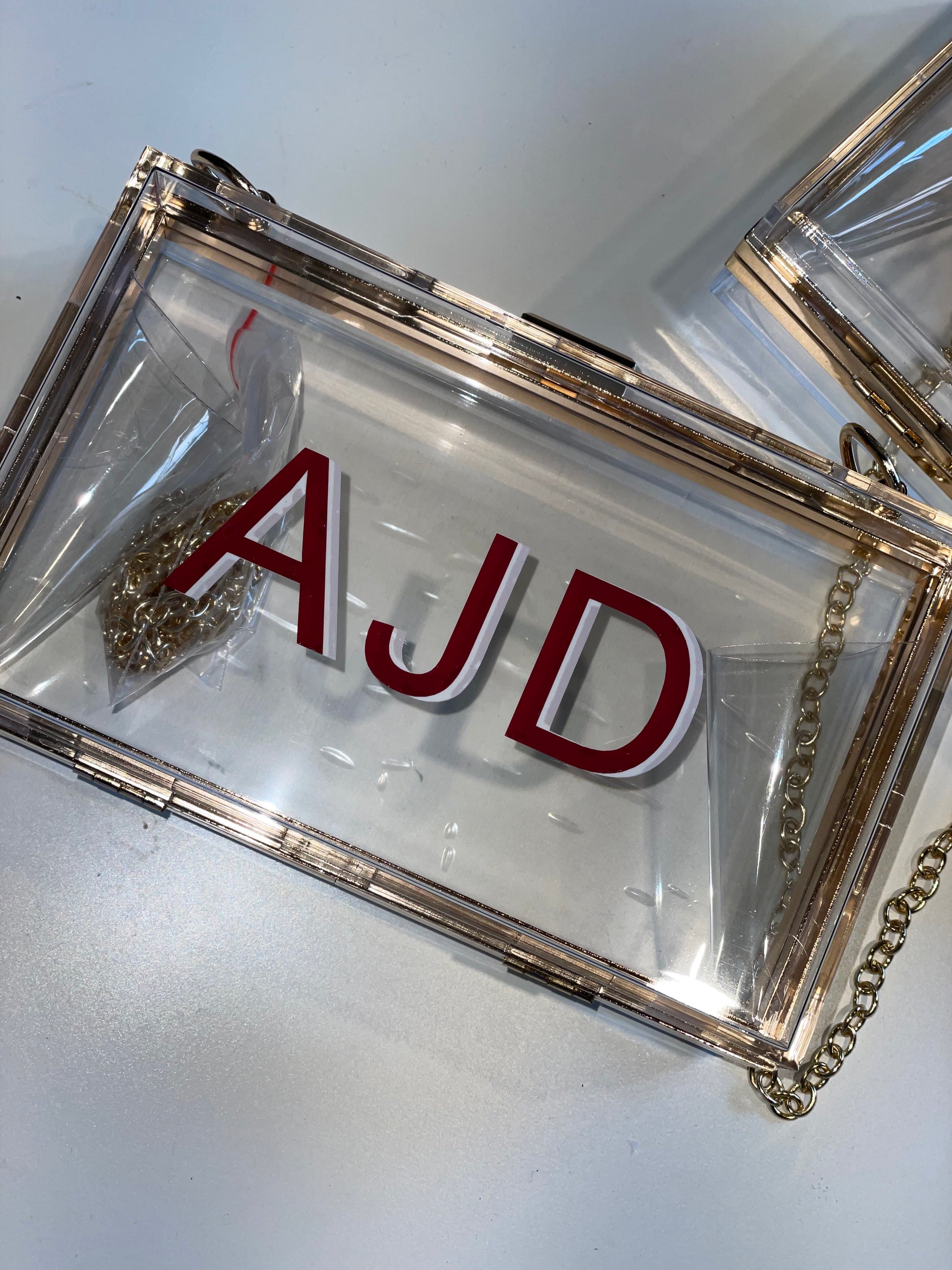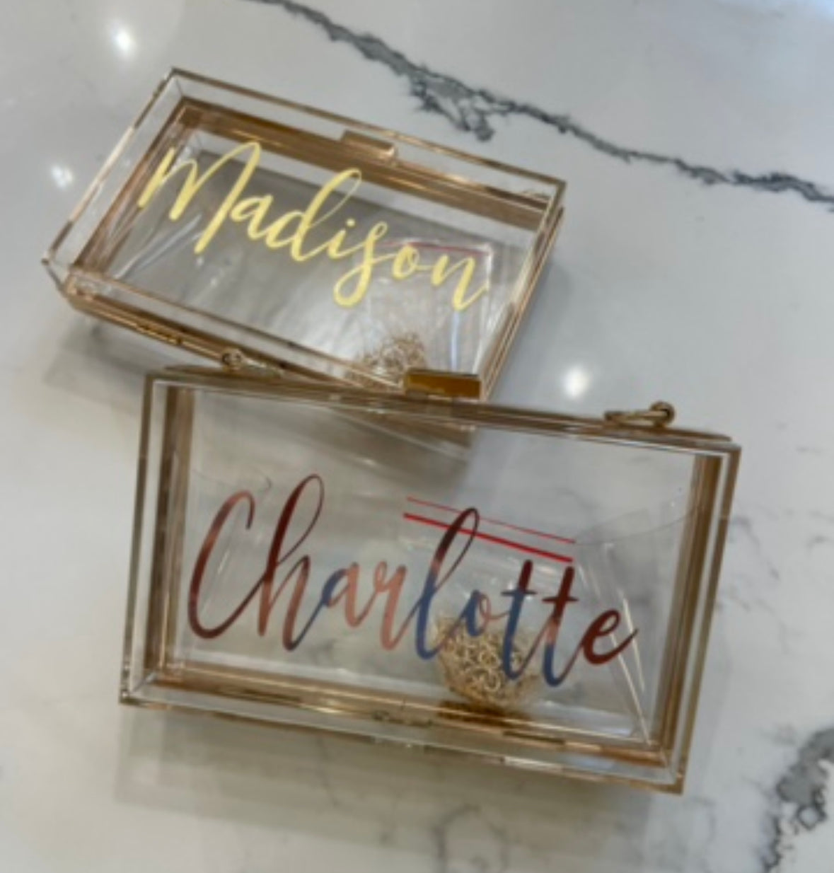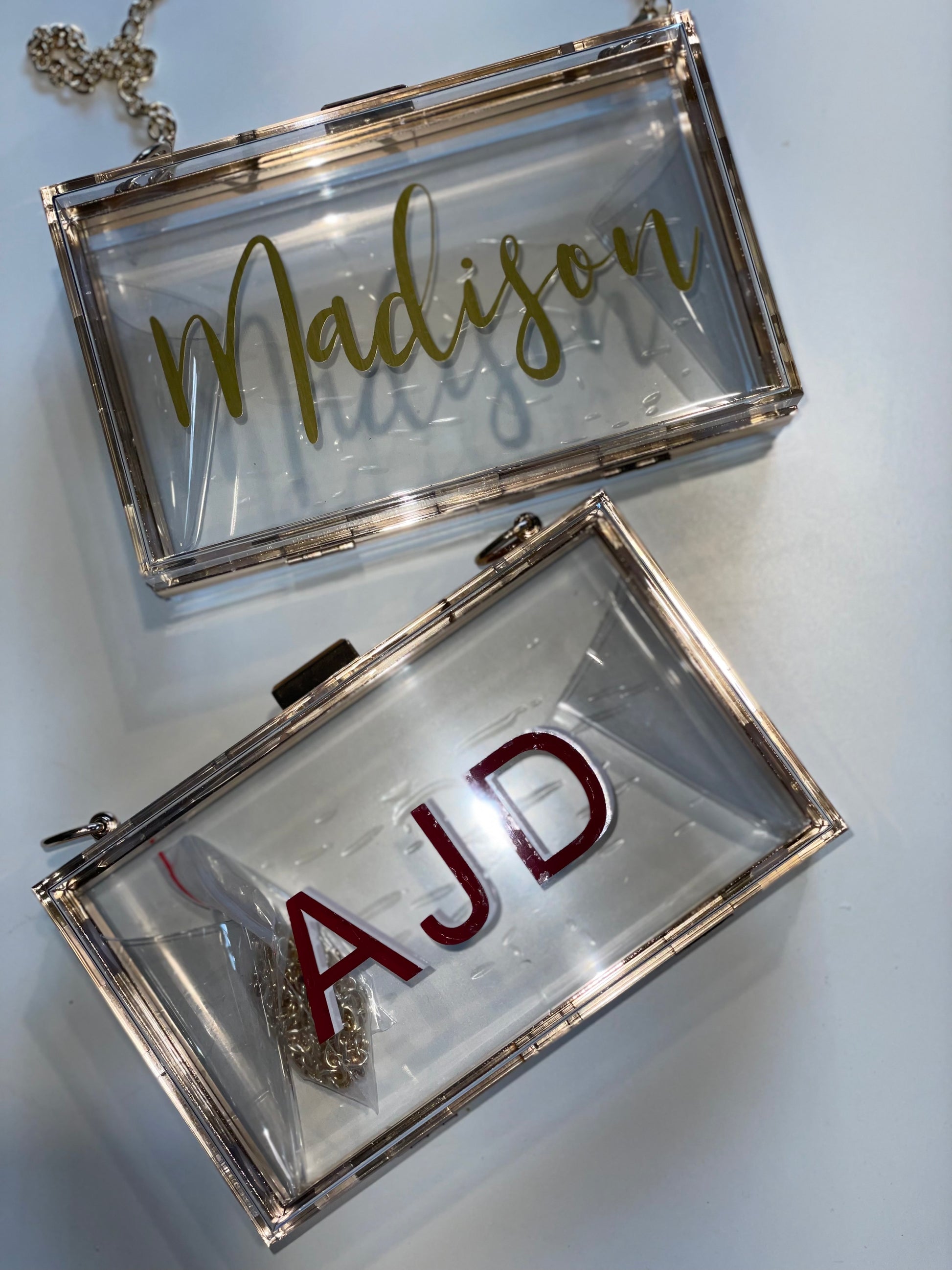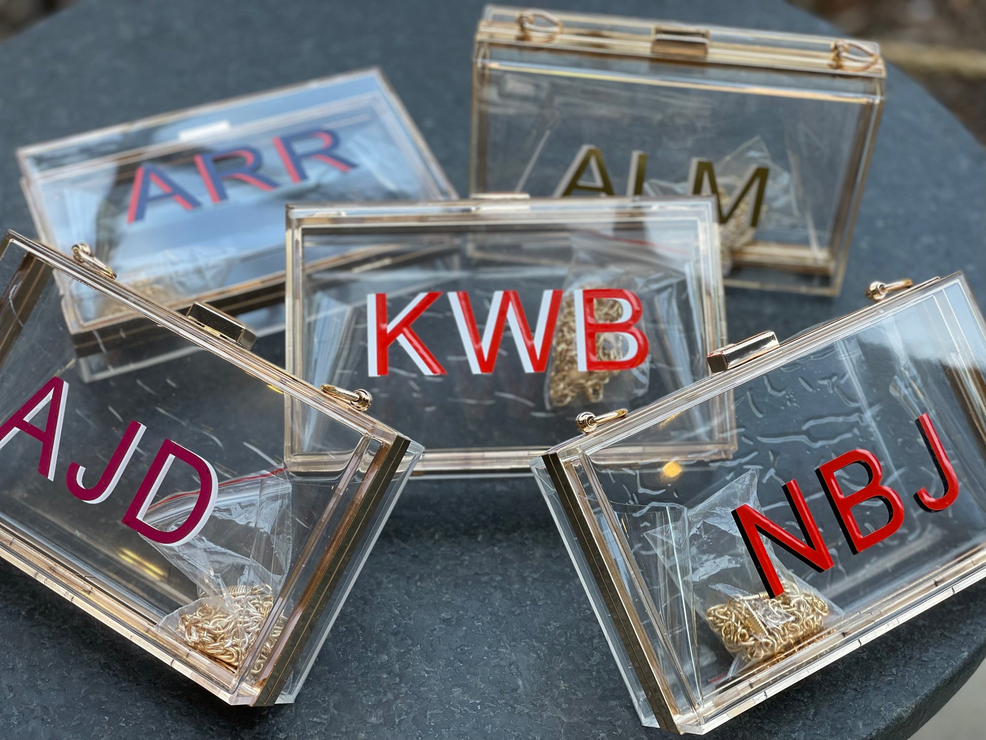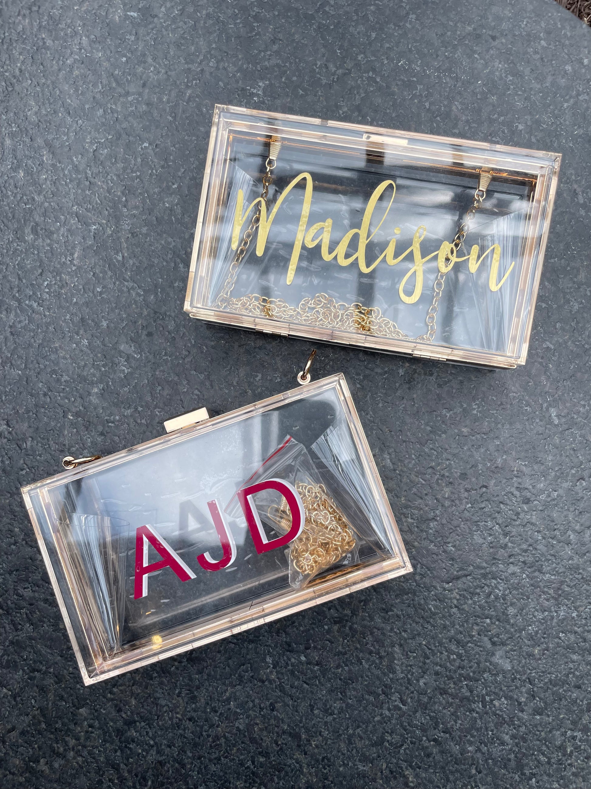 Personalized clutch purse with her name or monogram makes the cutest gift. Each bag comes with a removable chain.